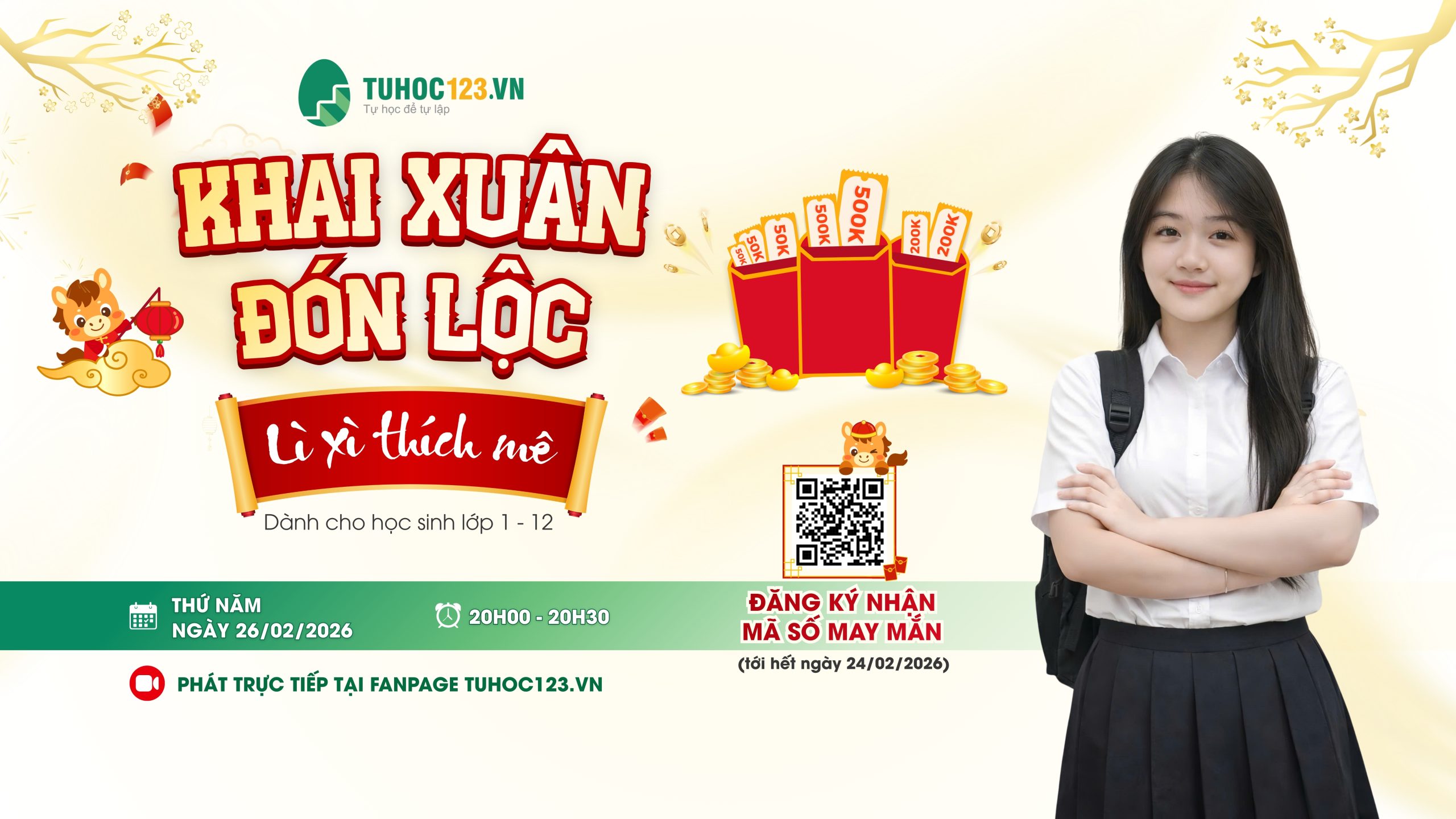 Tết đến Xuân về là thời khắc khởi đầu cho những ước mơ, kế hoạch và mục tiêu mới. Trong không khí rộn ràng chào đón năm Bính Ngọ 2026, chương trình “Khai Xuân Đón Lộc – Lì Xì Thích Mê” của Tuhoc123.vn chính thức khởi động. Chương trình lì xì khai xuân 2026 với nhiều phần quà hấp dẫn dành cho học sinh lớp 1 – 12 trên toàn quốc.